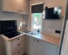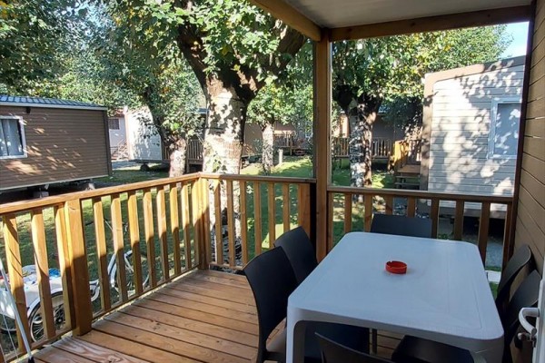 DOM MOBILNY 5 OSÓB Mobilome o powierzchni około 32 m2 z zadaszoną werandą, składający się z: pierwszej sypialni z łóżkiem małżeńskim (w tym 2 pojedynczych), drugiej sypialni z 2 pojedynczymi łóżkami, łazienki z prysznicem/WC, salonu z aneksem kuchennym i rozkładaną sofą (1 miejsce). Werandy ze stołem i krzesłami. Oferuje łazienkę z prysznicem, telewizję satelitarną, suszarkę do włosów, klimatyzację i ogrzewanie zgodnie z lokalnymi standardami.