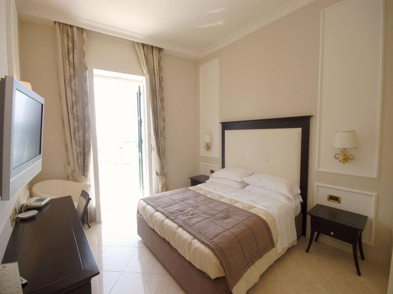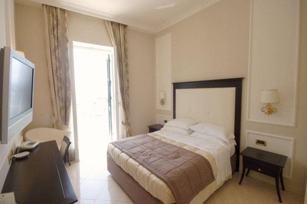 POTRÓJNY DELUXE Bardzo przestronny pokój o powierzchni około 32 metrów kwadratowych, elegancki i wyrafinowany, z widokiem na zabytkowe centrum. Łazienka z prysznicem (w niektórych pokojach znajduje się również wanna z hydromasażem), łóżkiem podwójnym i rozkładaną sofą. Wyposażony w kominek, idealny na nastrojowe zimowe wieczory nad morzem.